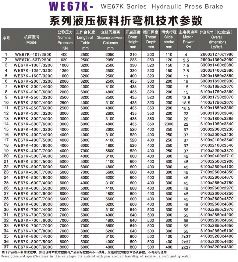 數控折彎機(WC67K)采用全鋼焊接結構,經回火時效處理消除內應力,具有良好的剛性及穩定性;伺服比例閥發出的流量和光柵尺的信號反饋結合,控制滑塊(Y1、Y2)同步運行;滑塊下死點重復精度為0.01mm,折彎角度為0.5度;滑塊快慢速度轉換點及上限位停靠點通過光柵尺反饋數控系統調整。